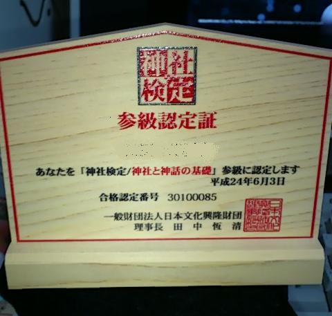 神社検定の合格認定証が届きましたのことよ。